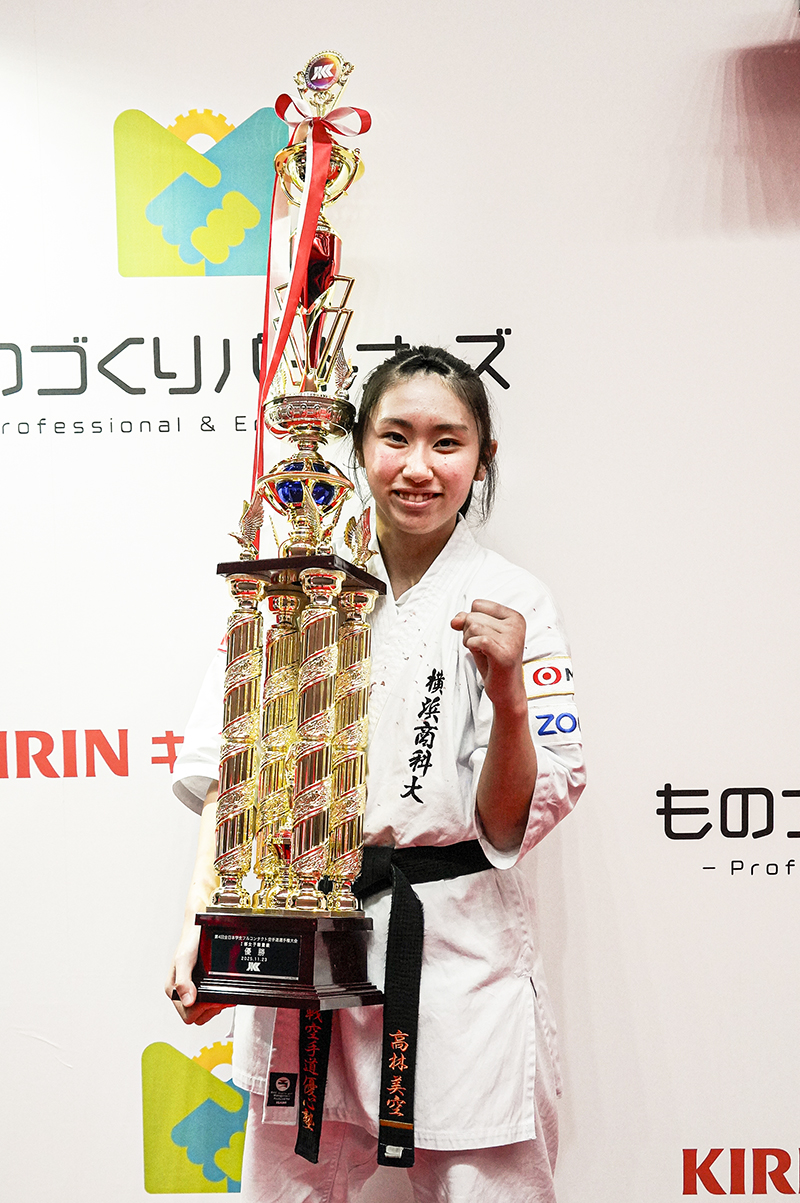 インカレは高校時代からずっと出場したいと思っていました。10月の自派の大会で準優勝だったので、今回、優勝することができてとてもうれしく思っています。最近、軸を意識した突きの稽古を重ねていたことで接近戦での勝負が多くなっていたのですが、今大会での決勝は対戦者の竹内悠敦(流通科学大学)選手が接近戦での攻防が巧かったので、あえて遠い間合いから突きを放つ組手で挑みました。今回優勝して、あらためて自分の学校名をつけた道着で戦う重みを感じました。インカレは学生という限られた期間の中で出場できる大会ですので、来年以降も出場し続けたいと思っています。