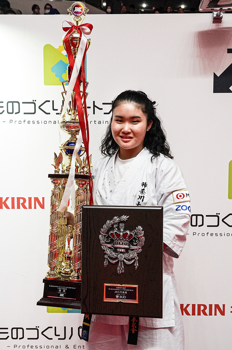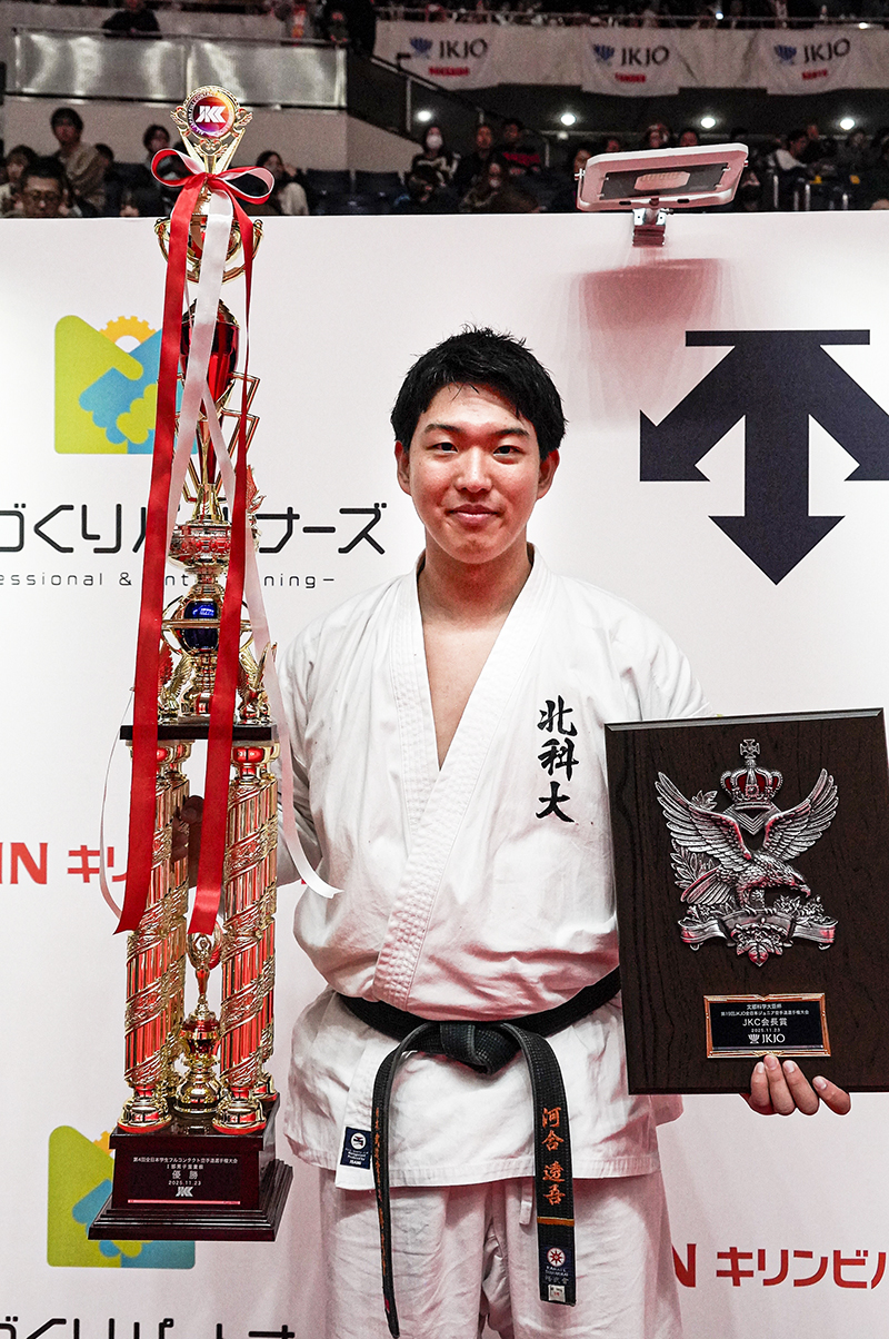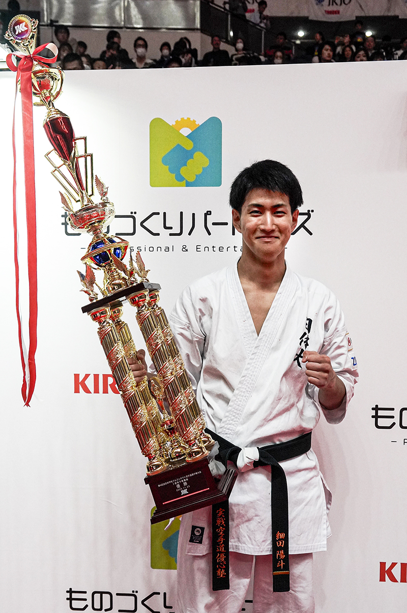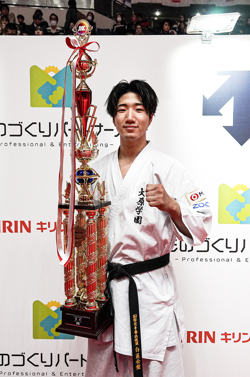 今、大学2年生で、インカレは今大会が初出場となりました。会場に入り、また開会式を経験して、大会規模の大きさに驚いたのと同時に、この大会で優勝したいという気持ちが俄然湧いてきました。今、こうして優勝トロフィーを抱くことができて、とてもうれしく思っています。体育大学に通っているのですが、残念ながら学校ではフルコンタクト空手という競技はあまり認識されていいません。だからこそ、こうして国に公式に認められた大会を開いて下さり、さらにそこで優勝できたということはとてもうれしく思っています。学校に帰ったら自分の優勝を報告して、他のオリンピック競技と同様にフルコンタクト空手への認識を高めてもらうよう務めたいと思っています。そうした活動がフルコンタクト空手の地位向上につながり、ひいては私や後輩たちの就職などといった人生にもつながっていくのだろうとあらためて感じました。こうした大会を開催してくださったJKCの皆様には感謝しております。